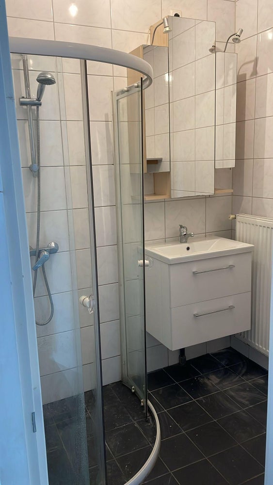 De badkamer van 8m² is uitgerust met extra kastruimte, een aparte douche, een wastafel met enkele hendel kraan en bijbehorende meubelstukken. Dit maakt het een praktische en stijlvolle ruimte voor uw dagelijkse routine.